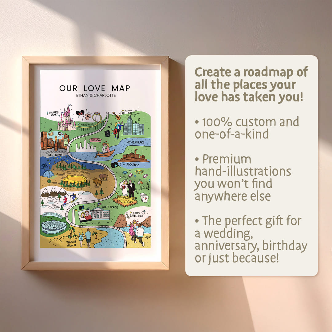 After purchasing, you will receive a detailed form to provide all the information needed for your map, including locations, names, people, pets, and any other details you want to include. Once completed, you will receive your map via email within 3 business days. If any changes are needed, you have 3 days to request revisions and receive the updated version. If you chose to print with us, once you approve the map via email, the order will go to print, and you will receive it at your home within 7 business days.